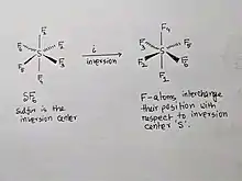 In an inversion through a centre of symmetry, i (the element), we imagine taking each point in a molecule and then moving it out the same distance on the other side. In summary, the inversion operation projects each atom through the centre of inversion and out to the same distance on the opposite side. The inversion center is a point in space that lies in the geometric center of the molecule. As a result, all the cartesian coordinates of the atoms are inverted (i.e. x,y,z to –x,–y,–z). The symbol used to represent inversion center is i. When the inversion operation is carried out n times, it is denoted by in, where when n is even and when n is odd.