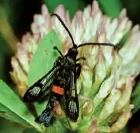 Synanthedon myopaeformis is a moth of the family Sesiidae and the order Lepidoptera. In Europe it is known as the red-belted clearwing and in North America as the apple clearwing moth. The larvae create galleries under the bark of fruit trees, especially old trees with damaged trunks. During this process, the larvae cause significant damage to host trees. Particular attention has been paid to the damage they cause to apple trees. Their status as a pest of apple orchards has led to many research projects aimed at controlling populations of the moth. This moth is native to Europe, the Near East and North Africa. Recently, the moth was introduced into North America, being first detected in Canada in 2005. There are several organisms that threaten the larvae, including parasitoids, nematodes, and bacteria.[1][2][3]