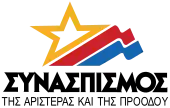 The Coalition of the Left, of Movements and Ecology[3][7] (Greek: Συνασπισμός της Αριστεράς των Κινημάτων και της Οικολογίας, Synaspismós tīs Aristerás tōn Kinīmátōn kai tīs Oikologías), commonly known as Synaspismos (Greek: Συνασπισμός, Synaspismós, "Coalition") and abbreviated to SYN (ΣΥΝ), was a Greek political party of the radical New Left. It was founded in 1991 and was known as the Coalition of the Left and Progress (Greek: Συνασπισμός της Αριστεράς και της Προόδου, Synaspismós tīs Aristerás kai tīs Proódou) until 2003. In 2004 SYN was a founding member of the Party of the European Left.[8]