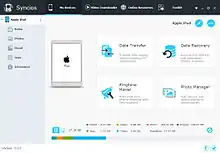 Syncios (or Syncios Mobile Manager) is a mobile device management and mobile data transfer software developed by Anvsoft Inc. It is also a media player, online video downloader, handset ringtone maker.[1] Moreover it is used to play, download, and organize digital audio and video; transfer data between mobile phones, tablets and personal computers running the OS X or Microsoft Windows operating systems. The program is available for iOS management (iPhone, iPad, and iPod Touch) and Android devices management. Latest Android OS is supported. Ios16.0 and 16.0.2 are NOT supported. Furthermore this application's installation components do not register with Windows App Wizard, thereby evading the ease of uninstallation by the lay user.