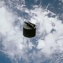 The three early Syncom satellites were experimental spacecraft built by Hughes Aircraft Company's facility in Culver City, California, by a team led by Harold Rosen, Don Williams, and Thomas Hudspeth.[2] All three satellites were cylindrical in shape, with a diameter of about 71 centimeters (28 in) and a height of about 39 centimeters (15 in). Pre-launch fueled masses were 68 kilograms (150 lb), and orbital masses were 39 kilograms (86 lb) with a 25-kilogram (55 lb) payload. They were capable of emitting signals on two transponders at just 2 W. Thus, Syncom satellites were only capable of carrying a single two-way telephone conversation, or 16 Teletype connections. As of 25 June 2009, all three satellites are still in orbit, although no longer functioning.[3]