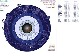 The synoptical horoscope has its own unique way of drawing: we can view the tropical signs inside of the chartwheel, the sidereal zodiac is in the middle and the real constellations can be found in the outermost zone.[2]