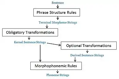 Chomsky's transformational grammar has three parts: phrase structure rules, transformational rules and morphophonemic rules.[69] The phrase structure rules are used for expanding grammatical categories and for substitutions. These yield a string of morphemes. A transformational rule "operates on a given string ... with a given constituent structure and converts it into a new string with a new derived constituent structure."[8] It "may rearrange strings or may add or delete morphemes."[70] Transformational rules are of two kinds: obligatory or optional. Obligatory transformations applied on the "terminal strings" of the grammar produce the "kernel of the language".[69] Kernel sentences are simple, active, declarative and affirmative sentences. To produce passive, negative, interrogative or complex sentences, one or more optional transformation rules must be applied in a particular order to the kernel sentences. At the final stage of the grammar, morphophonemic rules convert a string of words into a string of phonemes.[70] Chomsky then applies this idea of transformational rules in the English auxiliary verb system.[71]