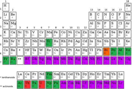 A synthetic element is one of 24 known chemical elements that do not occur naturally on Earth: they have been created by human manipulation of fundamental particles in a nuclear reactor, a particle accelerator, or the explosion of an atomic bomb; thus, they are called "synthetic", "artificial", or "man-made". The synthetic elements are those with atomic numbers 95–118, as shown in purple on the accompanying periodic table:[1] these 24 elements were first created between 1944 and 2010. The mechanism for the creation of a synthetic element is to force additional protons into the nucleus of an element with an atomic number lower than 95. All known (see: Island of stability) synthetic elements are unstable, but they decay at widely varying rates: the half-lives of their longest-lived isotopes range from microseconds to millions of years.