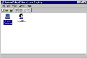 System Policy Editor is a graphical tool provided with Windows 95, Windows NT 4.0, and Windows 98. System policies are made up from a set of registry entries that control the computer resources available to a user or group of users.[1] These registry entries can be applied to individual users, groups of users, or to anybody logging on to a particular computer.