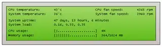 Software monitors occur more commonly, sometimes as a part of a widget engine. These monitoring systems are often used to keep track of system resources, such as CPU usage and frequency, or the amount of free RAM. They are also used to display items such as free space on one or more hard drives, the temperature of the CPU and other important components,[2] and networking information including the system IP address and current rates of upload and download. Other possible displays may include the date and time, system uptime, computer name, username, hard drive S.M.A.R.T. data, fan speeds, and the voltages being provided by the power supply.