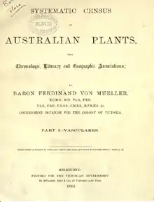 The Systematic census of Australian plants, with chronologic, literary and geographic annotations, more commonly known as the Systematic Census of Australian Plants, also known by its standard botanic abbreviation Syst. Census Austral. Pl.,[1] is a survey of the vascular flora of Australia prepared by Government botanist for the state of Victoria Ferdinand von Mueller and published in 1882.