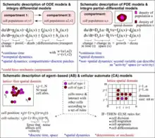 Partial differential equation (PDE) models are an extended version of the ODE model, which describes the time evolution of each variable in both time and space. PDEs are used on a microscopic level for modeling continuous variables in the sensing and recognition of pathogens pathway. They are also applied for physiological modeling[9] to describe how proteins interact and where their movement is directed in an immunological synapse. These derivatives are partial because they are calculated with the respect to time and also with the respect to space. Sometimes a physiological variable such as age in cell division can be used instead of the spatial variables. Comparing the PDE models, which take into account the spatial distribution of cells, to the ODE ones, the PDEs are computationally more demanding. Spatial dynamics are an important aspect of cell signalling as it describes the motion of cells within a three dimensional compartment. T cells move around in a three dimensional lymph node while TCRs are located on the surface of cell membranes and therefore move within a two dimensional compartment.[10] The spatial distribution of proteins is important especially upon T cell stimulation, when an immunological synapse is made, therefore this model was used in a study where the T cell was activated by a weak agonist peptide.[11]