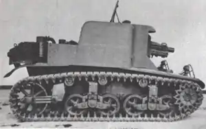 The T18 Howitzer Motor Carriage, abbreviated as HMC. was an American self-propelled gun. Its development started in September 1941 as a close-support vehicle using the M3 Stuart's chassis. A 75 mm howitzer was mounted on the right front of the vehicle. The gun mount was adapted from the M3 Grant. Two prototypes were produced by Firestone and then sent to the Aberdeen Proving Ground.[3] However, they were unsatisfactory because of their high superstructure and nose weight. Because the Army disliked the high superstructure and nearly vertical armor, the T18 was abandoned in 1942, and soon started a new turreted project, the T41 75 mm HMC, also known as the Howitzer Motor Carriage M8.[1][2]