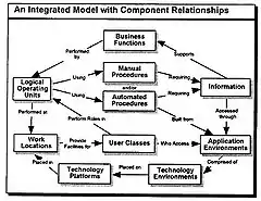 The "Integrated Model of Four Architectural Views" is part of the target architecture, defined in the TAFIM. It gives a vision on the organization in all of its architectural views, especially the work architecture. The model, see figure, depicts an overall framework to develop the target architecture deliverable. Each view of the target architecture has some overlap with aspects of the other views. This overlap supports the argument that the model depicts the developing of a single, integrated architecture.[9]