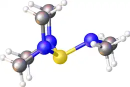 The cation [((CH3)2N)3S]+ is a sulfonium ion. The S-N distances are 1.612 and 1.675 pm. The N-S-N angles are 99.6°. The anion is [F2Si(CH3)3]−. It is trigonal bipyramidal with mutually trans fluorides. The Si-F distances are 176 picometers. The Si-C distances are 188 pm.[2]