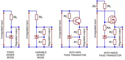Adding an emitter follower converts a shunt regulator into a series regulator. Efficiency is mediocre because single npn-type transistors or Darlington pairs require fairly a high collector-emitter voltage drop.[28] A single common-emitter pnp-type transistor can operate correctly in saturation mode, with only ≈0.25 V voltage drop, but also with impractically high base currents.[29] A compound pnp-type transistor does not need as much drive current, but it requires at least a 1 V voltage drop.[29] An N-channel power MOSFET device enables the best combination of low drive current, very low dropout voltage, and stability.[29] However, low-dropout MOSFET operation requires an additional high-side voltage source (ΔU in schematic) for driving the gate.[29] ΔU can be obviated if a depletion mode MOSFET is used.