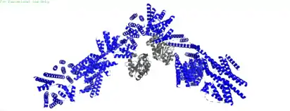 The human THO complex comprises six subunits, THOC1, −2, –3, −5, –6, and −7. Four of them have counterparts in Saccharomyces cerevisiae: THOC1 (yeast Hpr1), −2 (yeast Tho2), −3 (yeast Tex3), and −7 (yeast Mft1).[7][9] THOC1 is the first protein identified in THO complex. THOC2 is the largest subunit of TREX. It acts as a scaffold for the formation of the complex. The C-terminal domain of THOC2 directly interacts with nucleic acids. Mutational variants of THOC2 have been associated with syndromic intellectual disabilities, causing seizures, tremors, speech delays, and more.[10][11] THOC 3 and 6 both contains WD40 repeat motifs that allow interaction with other THO proteins.[12] THOC5 and THOC7 binds tightly and forms a dimer at their coiled coil domain (CCD). Four THO complexes form a tetramer, and each THO complex binds with one UAP56 protein at THOC2 and THOC1.
