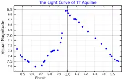 The visual apparent magnitude of TT Aql ranges from 6.52 to 7.65 over 13.7546 days.[3] The light curve is asymmetric, with the rise from minimum to maximum brightness only taking half the time of the fall from maximum to minimum.[11]