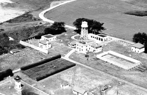 The Humboldt Harbor Light located on the north spit of the Humboldt Bay Bar entrance had for many years been criticized as being too low. In 1892 the Lighthouse Service constructed a light station on Table Bluff, a promontory south of Humboldt Bay, but within-view of the bay. The original station consisted of a duplex Victorian quarters, fog-signal building, and a keepers quarters with light tower attached. The quarters were redwood Italianette-stick Victorian, and the keepers quarters/ light tower were almost exactly the same as San Luis Obispo Light. There were also two wash houses, an oil house and a carpenter shop. In 1906 the Navy established a radio station on the property and during World War II the station was expanded to include lodging for mounted beach patrols, a coastal lookout post, and a radio compass station. During the war and immediately afterwards most of the original buildings were razed along with some of the newer structures. The quarters portion of the lighthouse was razed leaving only the tower. This and the fog signal building were all that remained of the original buildings.