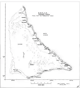 Taborio is situated on three and a half hectares of land surrounded by sea on all sides or reef-mud at low tide except where it is joined onto Nootoue village on its southern end.[1]
