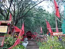Within the Satsana Phi belief system, supernatural deities (ຜີ, ผี, [pʰiː]) or gods can sometimes be the tutelary gods of buildings or territories, of natural places, or of things. Deities can also be ancestral spirits, or other types of spirits of seemingly supernatural forces. Such deities often interact with the world of the living, at times protecting people, and at other times seeming to cause harm. Guardian deities of places, such as the phi wat (ຜີວັດ, ผีวัด) of temples and the lak mueang (ຫລັກເມືອງ, หลักเมือง, [lak mɯːaŋ]) of towns are celebrated and propitiated with communal gatherings and offerings of food. Gods of Hindu derivation are included in the Satsana Phi pantheon of gods, as well as several indigenous non-Hindu gods called phi thien (ຜີແຖນ, ผีแถน).[3] Gods are ubiquitous, with some of them being associated with the universal elements: heaven, earth, fire, and water.