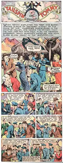 Tailspin Tommy was an air adventure comic strip about a youthful pilot, "Tailspin" Tommy Tomkins (sometimes spelled Tompkins). Originally illustrated by Hal Forrest and initially distributed by John Neville Wheeler's Bell Syndicate and then by United Feature Syndicate, the strip had a 14-year run from May 21, 1928 to March 15, 1942.[1]