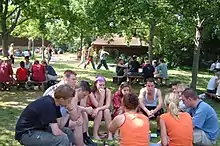 The Taizé Community attempts to send pilgrims back from youth meetings to their local churches, to their parishes, groups or communities, to undertake, with many others, a "Pilgrimage of Trust on Earth."[21] Every year around New Year (usually from 28 December to 1 January), a meeting in a large European city attracts several tens of thousands of young adults.[22][23] It is organized by brothers of the Taizé Community, sisters of St. Andrew, and young volunteers from all over Europe, and from the host city. The participants stay with local families or in very simple group accommodations. In the morning, they take part in a program organized by the parish closest to their accommodation. For their midday meal, all participants travel to a central location, usually the local exhibition halls. The meal is followed by a common prayer, and the afternoon is spent in workshops covering faith, art, politics and social topics. In the evening, everyone meets again for the evening meal and an evening prayer.
