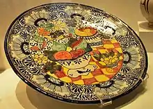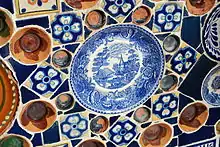 The Mexican pottery is a type of majolica (faience) or tin-glazed earthenware, with a white base glaze typical of the type.[2] It comes from the town of San Pablo del Monte (in Tlaxcala) and the cities of Puebla, Atlixco, Cholula, and Tecali (all these four latter in the state of Puebla), because of the quality of the natural clay found there and the tradition of production which goes back to the 16th century.[3] Much of this pottery was decorated only in blue, but colors such as yellow, black, green, orange and mauve have also been used.[4] Majolica pottery was brought to Mexico by the Spanish in the first century of the colonial period. Production of this ceramic became highly developed in Puebla because of the availability of fine clays and the demand for tiles from the newly established churches and monasteries in the area. The industry had grown sufficiently that by the mid-17th century, standards and guilds had been established which further improved the quality, leading Puebla into what is called the "golden age" of Talavera pottery (from 1650 to 1750).[3] Formally, the tradition that developed there is called Talavera Poblana to distinguish it from the similarly named Talavera pottery of Spain. It is a mixture of Italian, Spanish and indigenous ceramic techniques.[2]
