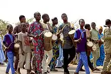 Hourglass-shaped talking drums are some of the oldest instruments used by West African griots[7] and their history can be traced back to the Bono people, Yoruba people, the Ghana Empire[9][10] and the Hausa people. The Yoruba people of south western Nigeria and Benin and the Dagomba of northern Ghana have both developed a highly sophisticated genre of griot music centering on the talking drum.[11] Many variants of the talking drums evolved, with most of them having the same construction mentioned above. Soon, many non-hourglass shapes showed up and were given special names, such as the Dunan, Sangban, Kenkeni, Fontomfrom and Ngoma drums.[9] This construction is limited to within the contemporary borders of West Africa, with exceptions to this rule being northern Cameroon and western Chad; areas which have shared populations belonging to groups predominant in their bordering West African countries, such as the Kanuri, Djerma, Fulani and Hausa.