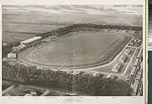 The race track, then named Tanfaran Park, opened for racing on November 4, 1899.[14] The 1 mi (1.6 km) oval track was oriented with its major axis lying along an imaginary line between the Golden Gate and Mount Hamilton.[15] The grandstand had seats for 3000 with a total capacity for 5000 spectators; service was provided by Southern Pacific on the Peninsula Commute via a stop in front of the grandstand, just 30 minutes from the Third and Townsend Depot.[15] Before races started, the neighboring Bay Area tracks agreed to have half the regular season raced at the California Jockey Club in Oakland (that racetrack opened as the Oakland Trotting Park in 1871[16] at the Emeryville Shellmound in what is now Emeryville),[17][18] and to split the remaining half between Ingleside in San Francisco and the new Tanfaran Park track in San Bruno.[19] The track's name quickly was corrupted to Tanforan Park within that first winter season, which lasted just two weeks, holding six races per weekday, from 1:30 PM to 4 PM.[20] In addition, six stakes races were scheduled to be run.[21]