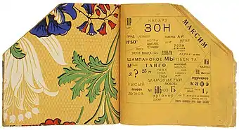 Tango With Cows: Ferro-Concrete Poems (Russian; Танго С Коровами: Железобетонные Поэмы) is an artists' book by the Russian Futurist poet Vasily Kamensky, with additional illustrations by the brothers David and Vladimir Burliuk.[1] Printed in Moscow in 1914 in an edition of 300,[1] the work has become famous primarily for being made entirely of commercially produced wallpaper, with a series of concrete poems - visual poems that employ unusual typographic layouts for expressive effect - printed onto the recto of each page.
