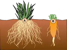 Dicots, one of the two divisions of flowering plants (angiosperms), start with a taproot,[2] which is one main root forming from the enlarging radicle of the seed. The tap root can be persistent throughout the life of the plant but is most often replaced later in the plant's development by a fibrous root system.[2][3] A persistent taproot system forms when the radicle keeps growing and smaller lateral roots form along the taproot. The shape of taproots can vary but the typical shapes include: