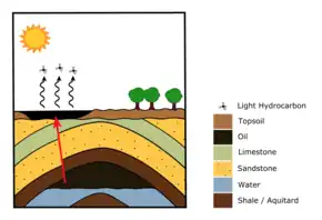 Tar pits are formed by the fractionation of crude oil at the surface. The lighter hydrocarbons of the crude oil, which include methane (CH4), ethane (C2H6), and propane (C3H8), evaporate, leaving behind larger hydrocarbons that make up the chemical composition of asphalt. This is a concern because methane, ethane, and propane are either major greenhouse gases and/or photochemical pollutants.[20] The La Brea Tar Pits emit about 500 kg of methane per day.[20] The emissions are the highest along the 6th Street Fault, which is the conduit that feeds the tar pits with crude oil from the sediments underneath Earth's surface.[20] It was also discovered that methane is evaporating out of the nearby soil, affecting the physiology of the native grasses. The La Brea Tar Pits have the highest natural gas flux measured for any onshore seepage zone in the United States.[20] On a global scale, geologic CH4 and C2H6 emissions estimates from gas seepage in sedimentary rock are in the order of 50-70 Tg/year and 2-4 Tg/year respectively. These values are roughly half of the global CH4 and C2H6 emissions from anthropogenic fossil fuel combustion, which are approximately 100-150 Tg CH4/year and 6-8 Tg C2H6/year.[20] These hydrocarbon emissions can be contributed to oil biodegradation and methanogenesis within the tar pits.[20]