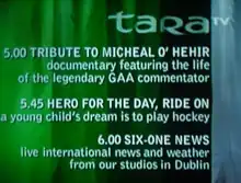 Tara Television had an exclusive option to purchase the majority of RTÉ's programming, and this accounted for about 80% of the total programmes broadcast by the station, with the remainder being filled by programmes purchased from other networks. It mainly broadcast news bulletins and current affairs programming, as well as extensive coverage of Irish sport, in particular, GAA. RTÉ made sure that from 16 July 2001, Tara Television was blocked to Irish Sky subscribers as they feared loss of advertising revenue.[1]