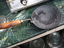 The Indian tawa might have a handle or not, and it can be made of cast iron or aluminium,[1] or of carbon steel. The utensil may be enameled or given a non-stick surface.[3][4] The tawa and saj are used in the cuisines of South,[1] Central, and West Asia, as well as of the Caucasus and the Balkans. The tawa is also used in Indo-Caribbean cuisine.[5]