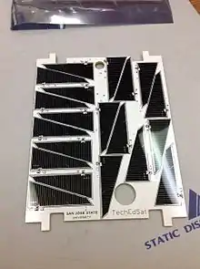 The first TechEdSat (later renamed "TechEdSat-1" or "TES-1")[2][3] was a 1U-Cubesat designed to evaluate Space Plug-and-play Avionics (SPA) designed in Sweden by ÅAC Microtec. It was also originally intended to perform a communications experiment utilizing the Iridium and Orbcomm satellite phone network,[4] although this function was disabled before launch.[5] TechEdSat was deployed into orbit from the International Space Station (ISS) on 4 October 2012. It reentered to atmosphere on 5 May 2013.[6]