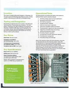 In 2014, TSP was one of the large-scale energy storage projects in the interconnection queue for the California Independent System Operator (CAISO) with planned benefits including firming renewable generation, frequency regulation, spin and non-spin replacement reserves, ramp management, and energy price arbitrage.[36] The TSP system was tested using eight core tests performed by the grid operator or under market control.[37] Some of the lessons learned included the challenges related to outage scheduling, challenges with interconnection agreements, benefits of component validation testing at the factories, and preparing detailed step-by-step test plans in advance.[30] Both the utility and system provider gained important perspectives and insights during the design, construction, commissioning, and operating of the TSP system.[38][6][22]