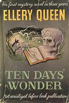 (See Ellery Queen.) After many popular mystery novels, a radio program and a number of movies, the character of Ellery Queen was at this point firmly established. This novel is the third to take place against the setting of the imaginary New England town of Wrightsville (following Calamity Town and The Murderer is a Fox) and, as is common in the Wrightsville novels, depends more on characterization, atmosphere and the observed minutiae of small-town American life than many other Queen novels; this novel less so, because of the necessity to make characters and events fit into the underlying format. "The town with its gossip and cliques is well done ... [one of] the complex and mundane mysteries ... favored by the ingenious authors."[1] "All Wrightsville murders are well written as more attention is given to character development and humor. The way some Wrightsville stories interlink only adds to the fun ... This is the era wherein Ellery Queen experiments with minimalism as his work is stripped down to its most fundamental features. ... The more fallible side to Ellery is especially emphasized. Nowhere else is the limitation of reason better shown than in Ten Days' Wonder. Ellery went through the turmoil of extreme self-doubt, almost giving up on being a detective ... and another double-twist ending. Brilliant portrayals, be it a little far-fetched."[2]