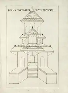 Tenavaram's gold-copper gilded roofs earned it fame amongst pilgrims and sailors, due to navigational purposes and its contribution to the town's appearance as a "golden city." Encompassed by a quadrangular cloister which opened under verandahs and terraces to the various deities' shrines, the complex contained gardens of shrubs and trees which priests used to pluck offerings to the deities.[2][21] The Portuguese historian Diogo do Couto stated that along with Adam's Peak, Tenavarai was the most celebrated temple on the island, and the most visited pilgrimage site of the south with a circuit of a full league, while his fellow Portuguese historian De Quieroz compares the temple port town's splendor to that of the Koneswaram temple of Trincomalee and states that Lord Vishnu was the primary deity of the destroyed shrine of Tenavarai.[22][23]