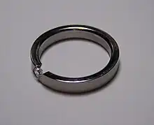 A tension ring is a type of finger ring that holds a gemstone in place by pressure rather than prongs, a bezel or other mounting. The metal setting is actually spring-loaded to exert pressure onto the gemstone, and tiny etchings or grooves in the metal create a shelf that supports the gemstone's edges. The gemstone appears to be suspended in the air with nothing holding it in place.