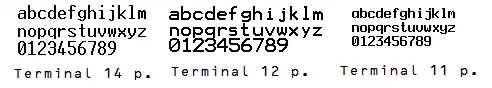 According to some strings hidden in the file, the original Terminal font size (9x12) was designed in 1984 by Bitstream Inc., also the DOSAPP.FON which is used by Windows for showing DOS applications in the window is just like Terminal with new sizes added. This typeface was designed in 1991 by Microsoft Corporation. The CGA and EGA versions of the Terminal font exist, but they share similarities with the IBM CGA font, with slight differences in characters.