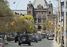 An unusual situation exists on Bay Street in Toronto, where the clock tower of Old City Hall lies at the northern end of the segment south of Queen Street West. However, Bay Street is a through street that curves to the west, intersecting Queen Street West at a 45-degree angle before curving back north along the western edge of Old City Hall and continuing towards Davenport Road. In a similar manner, the Thomson Building and Munich Re Centre office towers act as a vista for the northern section of Bay Street heading south.