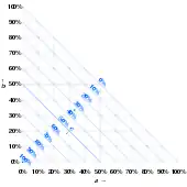 A ternary plot, ternary graph, triangle plot, simplex plot, Gibbs triangle or de Finetti diagram is a barycentric plot on three variables which sum to a constant.[1] It graphically depicts the ratios of the three variables as positions in an equilateral triangle. It is used in physical chemistry, petrology, mineralogy, metallurgy, and other physical sciences to show the compositions of systems composed of three species. In population genetics, a triangle plot of genotype frequencies is called a de Finetti diagram. In game theory, it is often called a simplex plot.[2] Ternary plots are tools for analyzing compositional data in the three-dimensional case.