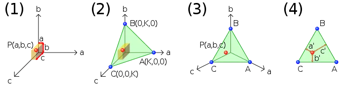 If a + b + c = K (a positive constant), P is restricted to a plane containing A(K,0,0), B(0,K,0) and C(0,0,K). If a, b and c each cannot be negative, P is restricted to the triangle bounded by A, B and C, as in (2).