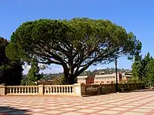 Terraces are used primarily for leisure activity such as sitting, strolling, or resting.[1][2] The term often applies to a raised area in front of a monumental building or structure, which is usually reached by a grand staircase and surrounded by a balustrade.[2] A terrace may be supported by an embankment or solid foundation, either natural or man-made.[1] Terraces may also be platforms, supported by columns but without the space below filled in,[1] but terraces are always open to the sky and may or may not be paved.[3]