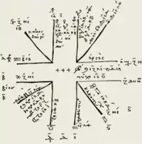 Chapter ten returns to the humoral theme more explicitly, clarifying that the zodiac is aligned to the seasons and so expressive of the shifting emphasis through moisture, warmth, dryness and cold, (as brought about by spring, summer, autumn, and winter). Similarly, the four angles of the chart present an humoral emphasis through association with the effects of the four cardinal winds that blow from their aligned directions.[56] The remainder of book one (up to the final two chapters which concern the planetary phases and aspectual applications), presents the rulerships, divisions, and configurations of the zodiac signs, most of which are related to astronomical definitions, seasonal effects, physics and geometry. Geometrical principles are used to define the favourable or unfavourable quality of astrological aspects, based on the angular relationship of planets and signs with ecliptic degrees.[15]