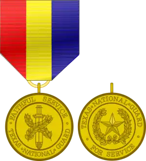 | Description | The ribbon drape is of red, old gold, and blue stripes. The medal is bronze with an emblem with crossed olive and live oak branches and the words "Faithful Service" and "Texas National Guard" on the obverse. The reverse contains the Coat of Arms of Texas and the words "Texas National Guard" and "For Service". |