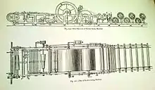 An example of a sizing machine made in 1919 by Howard and Bullough Ltd, Accrington, Lancashire, England, can be seen in the tape size room of Queen Street Mill Textile Museum, Burnley in Lancashire.[4] Other early twentieth century sizing machine manufacturers were Brook and Crowther, T., Ltd of Huddersfield, Butterworth and Dickinson Ltd, Burnley and Platt Bros & Co. Ltd.[3]