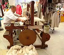 Two types of looms are employed in the making are handcrafted fabrics, the pre-Hispanic backstrap loom and the introduced European foot pedal loom. Traditionally, weaving, especially on the backstrap loom, was considered to be women's work. Women still produce items such as kitchen cloths, tablecloths, carrying bags and ornamental items with traditional designs. Although considered primitive, the backstrap loom is versatile and allows for different techniques and combinations of techniques, some of which can be very complicated. It allows for the combining of different fibers such as cotton with wool or silk.[7] Designs are woven into the cloth on this loom by changing thread colors and/or by adding items such as shells or other matter into the finished product. The backstrap loom is most prevalent in the south of the country.[1]