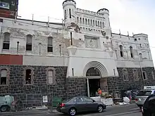 The First Regiment Armory in Portland was completed in 1888, but was immediately deemed too small, and so an Annex was commissioned to give troops stationed there more space for maneuvers. Amenities included an underground firing range.[2][3] Constructed in 1891, the annex was built in the Romanesque Revival style that was popular from 1880 to 1890 and is identified by massive stone cladding and semi-circular arcades. McCaw and Martin featured many Northwest quarry materials in the design.[4] The annex is also an example of Castellated architecture. The fortress-like structure has a recessed arched entrance flanked by turrets above. The turrets have crenelated parapets and loophole vertical gun slots.[5]