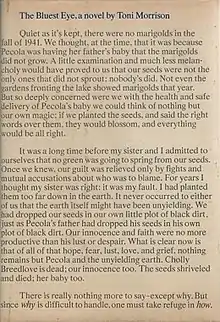 The novel received minimal critical attention when first published; however, it was placed on many university reading lists in black-studies departments, which promoted further recognition.[22] Morrison was praised for her handling of difficult themes: critic Haskel Frankel said, "Given a scene that demands a writer's best, Morrison responds with control and talent."[26] The first major sign that the book would succeed was an extremely positive review in The New York Times in November 1970.[26] Morrison was also positively reviewed for her break from the status quo of usual novels from the time period, writing to a wider audience and focusing on black subculture in the 1940s, rather than the military culture of the time. African-American critic Ruby Dee wrote, "Toni Morrison has not written a story really, but a series of painfully accurate impressions."[27] Morrison was additionally praised for her wide coverage of emotion in the novel, extending from Pecola Breedlove's quiet descent into madness, to Cholly Breedlove's skewed mindsets.[27]