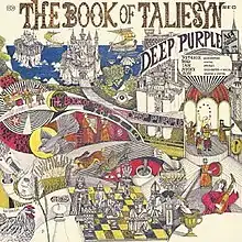 Cover art and sleeve notes convey Tetragrammaton's decision to aim the album at the vast American hippie audience, which was very influential in the US at the time.[40] The notes in particular were written in a mystical tone, evoking the bard Taliesyn as a spiritual guide and comparing listening to the songs to an exploration in the band members' souls.[50] The original cover was drawn in pen, ink and color by the British illustrator and author John Vernon Lord, who coincidentally appears to share the same name as Deep Purple's keyboard player. The Book of Taliesyn was the only record cover John Vernon Lord ever designed and, according to the artist's recent retrospective book Drawing upon Drawing, the original artwork was never returned.[51] In his book, John Vernon Lord remembers the assignment received from his agency Saxon Artists: