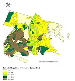 Despite significant investment compared to the post war period, many exacerbated social problems remain including high rates of violent crime, substance abuse, overcrowding, and substandard housing conditions.[84][85][86][87] The Bronx has the highest rate of poverty in New York City, and the greater South Bronx is the poorest area.[88][89]