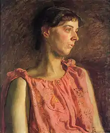 The Concert Singer remained in Eakins's possession until his death. It was exhibited several times during his lifetime, but he was unable to sell it.[11] Eakins thought well of the picture, and priced it accordingly: in 1893 and 1895 he asked $1,000 for it, raising the price to $5,000 in 1914.[10] In 1914 Weda Cook asked to purchase the painting, but Eakins replied that he could not part with it because "it must be largely exhibited yet", and because of its sentimental value to him: "I have many memories of it, some happy, some sad".[28] After his death the painting was appraised for only $150.[10] The painting was given to the Philadelphia Museum of Art in 1929 by Eakins's widow Susan Macdowell Eakins (1851–1938), and Miss Mary Adeline Williams,[1] the latter a close friend who lived with Eakins and his wife for long periods.